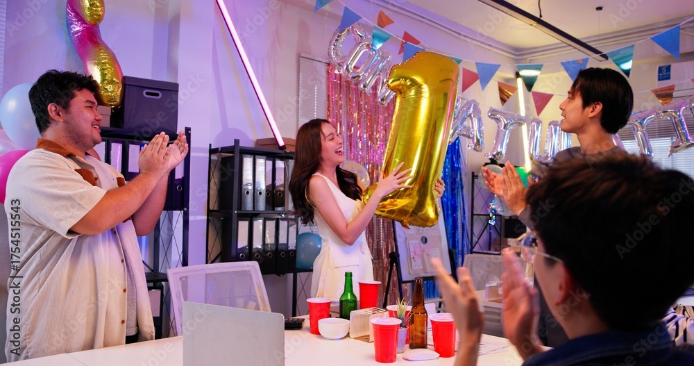 Group of young Asian coworkers man and woman celebrate their number one achievement at a fun office party. A modern business team enjoying success with balloons, cheers, and joyful expressions.