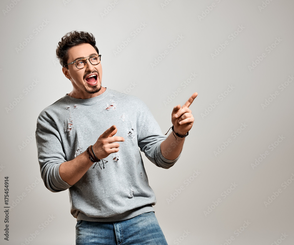 Handsome young Fashion guy Pointing Open Mouth. Brunette Bearded man Having Fun Emotional Sporty Confident. Autumn Trendy Outfit, Glasses. Stylish Hairstyle, fashionable gray jumper. Blue Eyes
