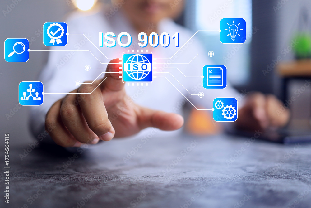 ISO 9001 international standard quality management concept with a businessman pointing on microchips represent to software implement in organization to help manage in factory quality system