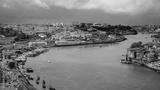 A wide, panoramic, high-angle view of the Douro River flowing through the cities of Porto and Vila Nova de Gaia in Portugal.