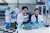 Lab work, Doctor holds a test tube takes the test from a test tube in analysis, blood, DNA, test tube stand.