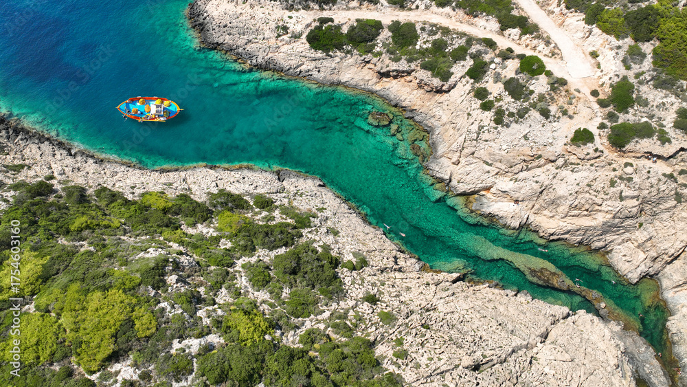 Aerial drone photo of traditional fishing boat anchored in small fjord bay of Korakonisi ideal for snorkeling, Zakinthos island, Ionian, Greece