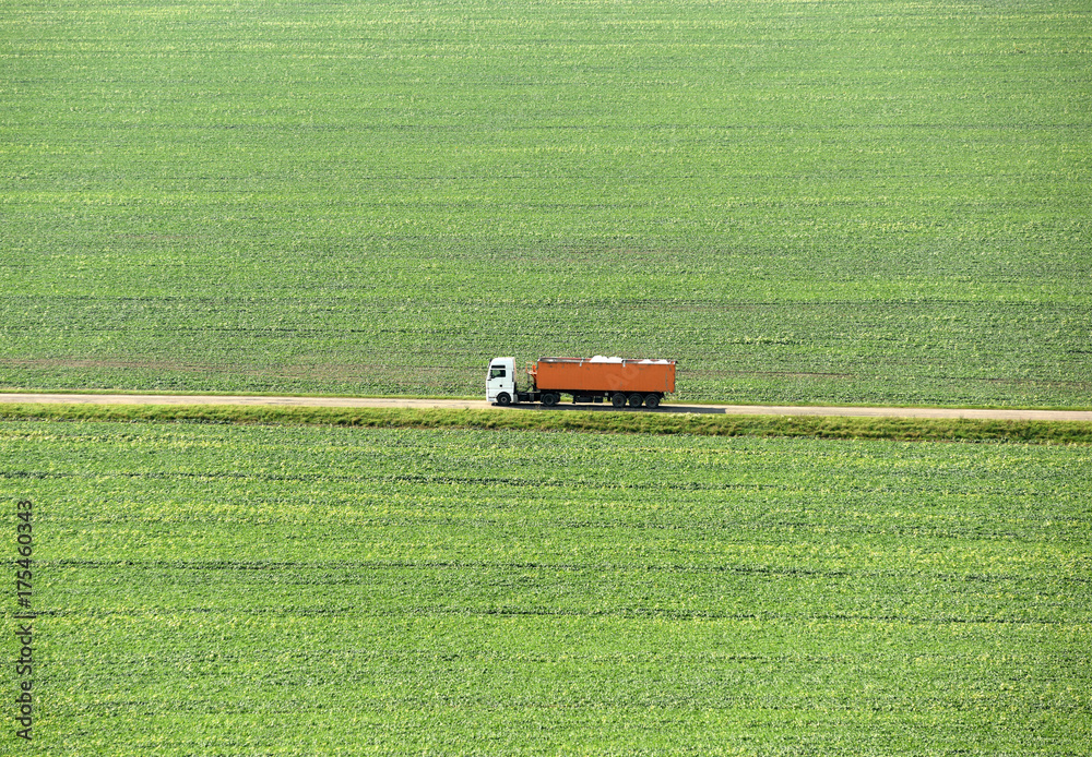 the truck goes on the road on a green field, top view