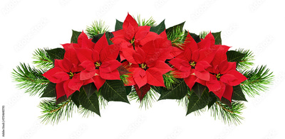 Red poinsettia flowers and pine twigs in a Christmas waved arrangement isolated on white or transparent background. Holiday garland.