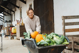 Woman pushing wagon full pumpkin and cabbage on farm outdoors.