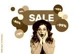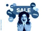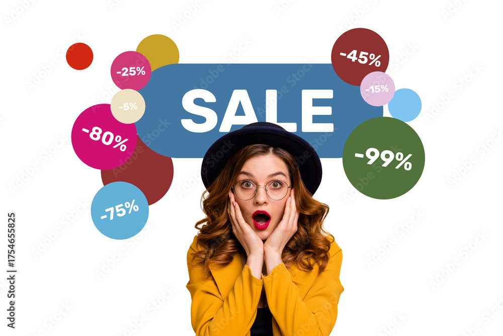 Composite photo collage of astonished pretty glamour girl wear suit hat glasses sale low price offer discount isolated on painted background