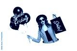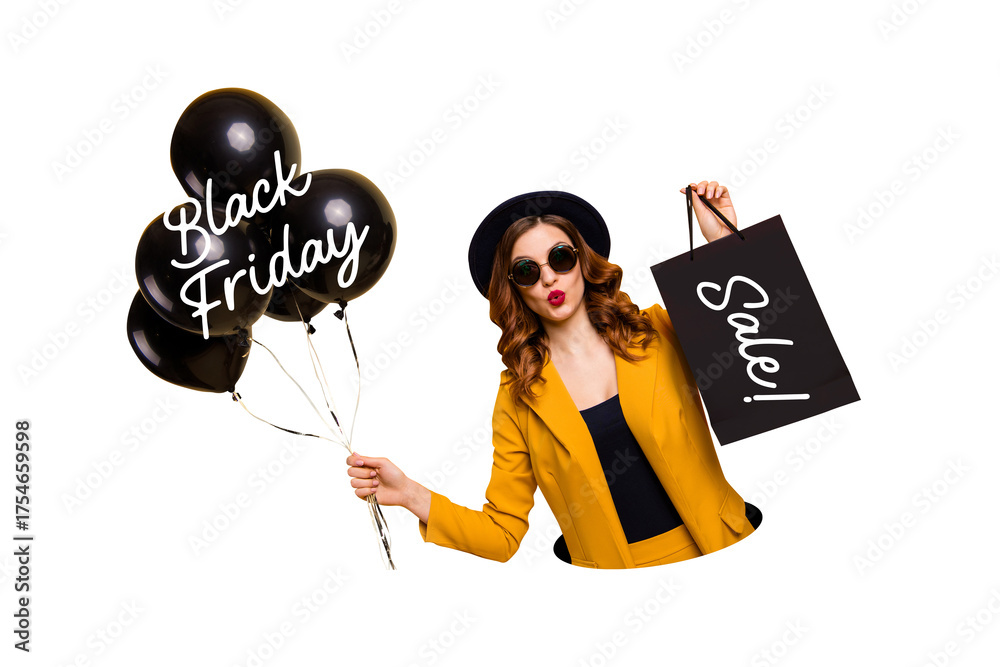Composite artwork sketch image collage of black friday sale promotion discount sell young lady style suit eyewear hat bag air balloons