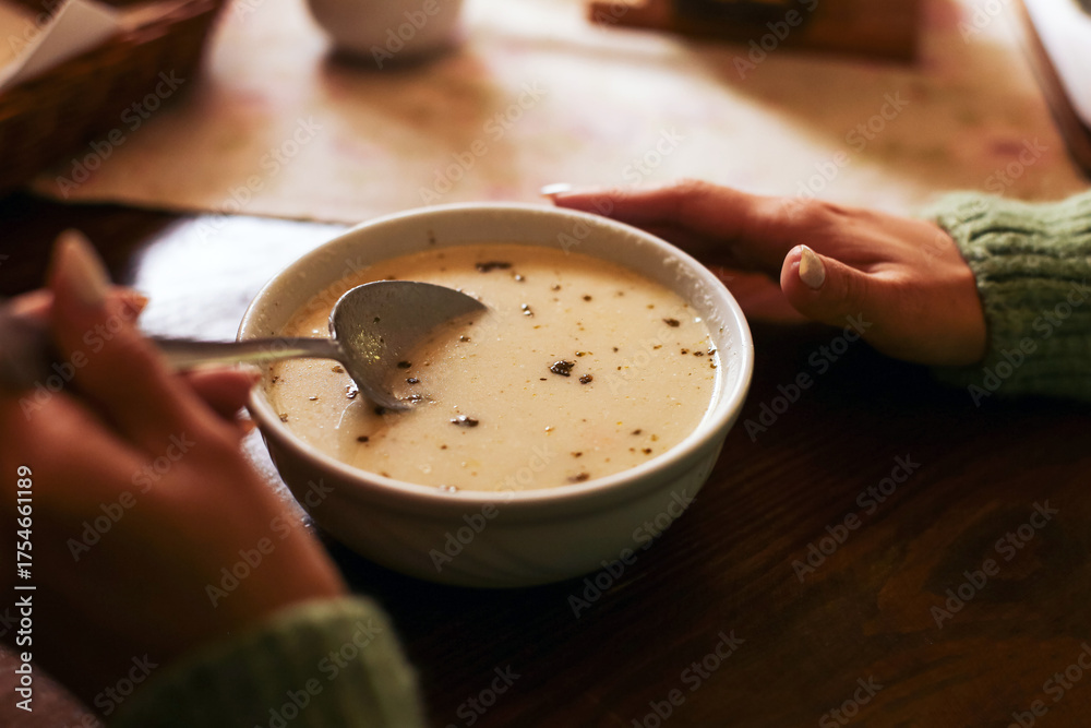Woman holding bowl of creamy soup with spoon in cozy warm light. Autumn home meal concept with hands and wooden table showing comfort and seasonal atmosphere.