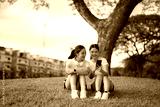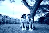 Two young Asian women friends are sitting on green grass, smiling and happily sharing content on a smartphone, enjoying a relaxed moment together in a park