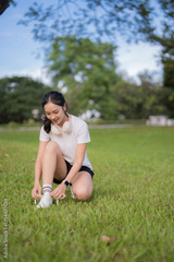 Asian woman crouching in a green park, tying shoelaces on her white sneakers, preparing for a refreshing outdoor run or exercise session, embodying an active and healthy lifestyle