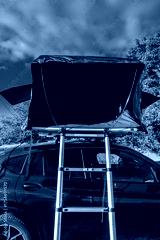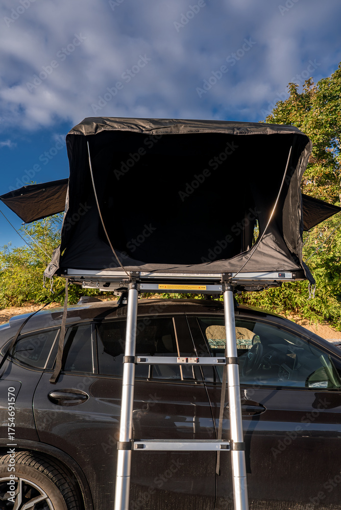 A black luxury SUV is parked with a rooftop tent and ladder set up. Bright daylight and blue sky suggest a coastal park setting. Wide tent flaps show quick setup.