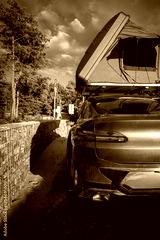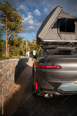Gray luxury SUV parks on a coastal road by dunes and a gabion wall. Rooftop tent is open near an oceanfront forest. Warm late day light and clouds add adventure mood.