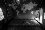 Quilted dark tent interior in a luxury SUV shows a stitched world map, padded floor, and ocean views through openings, with soft angled light suggesting evening travel.