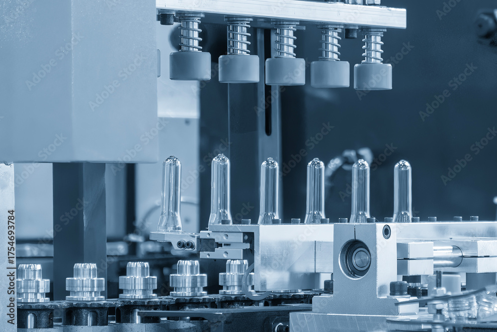 Conveyor belt deliver the preform shape to the blow mold machine.