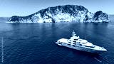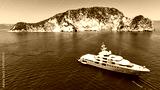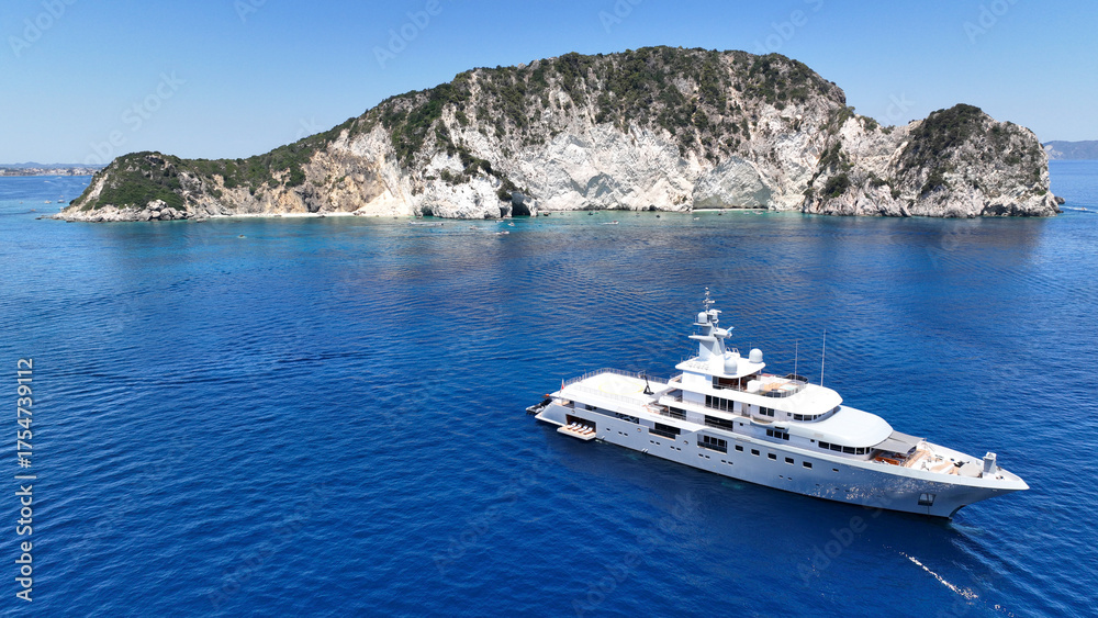 Aerial drone photo of scenic small paradise island of Marathonisi or Turtle island in bay of Laganas featuring a sandy beach where Caretta Caretta turtle eggs hatch, Zakynthos island, Ionian, Greece