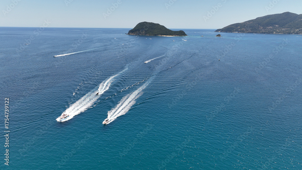 Aerial drone photo of scenic small paradise island of Marathonisi or Turtle island in bay of Laganas featuring a sandy beach where Caretta Caretta turtle eggs hatch, Zakynthos island, Ionian, Greece