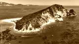 Aerial drone photo of scenic small paradise island of Marathonisi or Turtle island in bay of Laganas featuring a sandy beach where Caretta Caretta turtle eggs hatch, Zakynthos island, Ionian, Greece