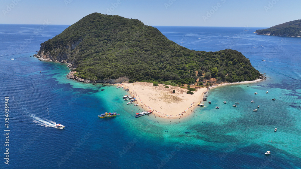 Aerial drone photo of scenic small paradise island of Marathonisi or Turtle island in bay of Laganas featuring a sandy beach where Caretta Caretta turtle eggs hatch, Zakynthos island, Ionian, Greece