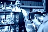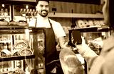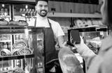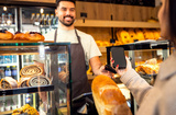 Smiling man working in bakery holding fresh bread and serving customer behind counter.
