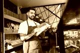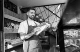 Smiling man working in bakery holding fresh bread and serving customer behind counter.