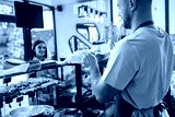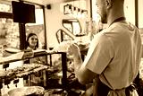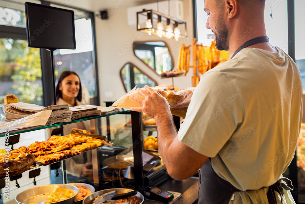 Smiling man working in bakery holding fresh bread and serving customer behind counter.