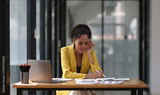 A businesswoman who is tired of sitting in the office for a long time is stressed and has a headache. Woman are stressed and in debt.