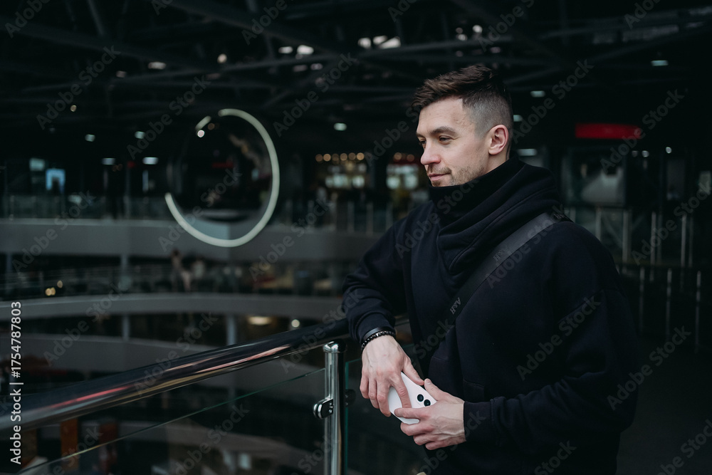 Thoughtful young man in black hoodie leaning on railing inside modern museum, candid portrait with dim ambient light and industrial architecture