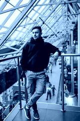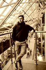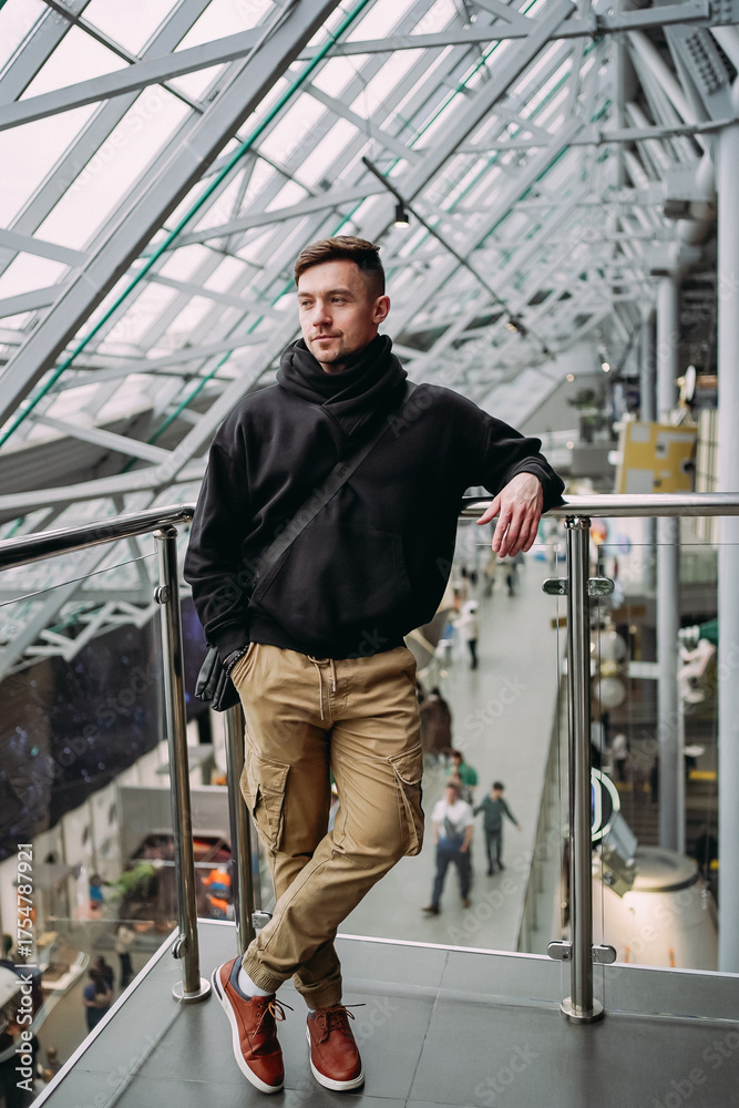 Casual portrait of young man leaning on glass railing inside modern atrium, relaxed urban style with airy architectural background