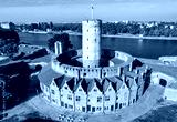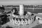 Medieval Wisloujscie Fortress with old lighthouse tower in port of Gdansk, Poland A unique monument of the fortification works. Aerial view