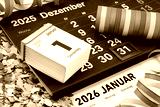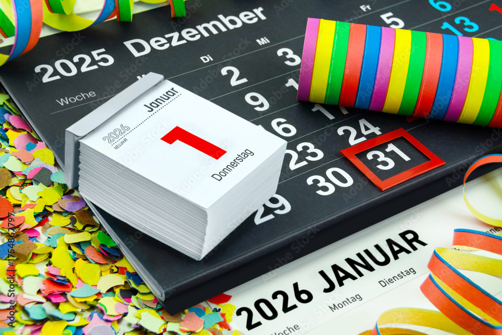 Deutscher Kalender Silvester 31. Dezember 2025 und 1. Januar 2026 mit Dekoration