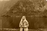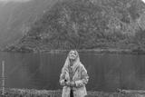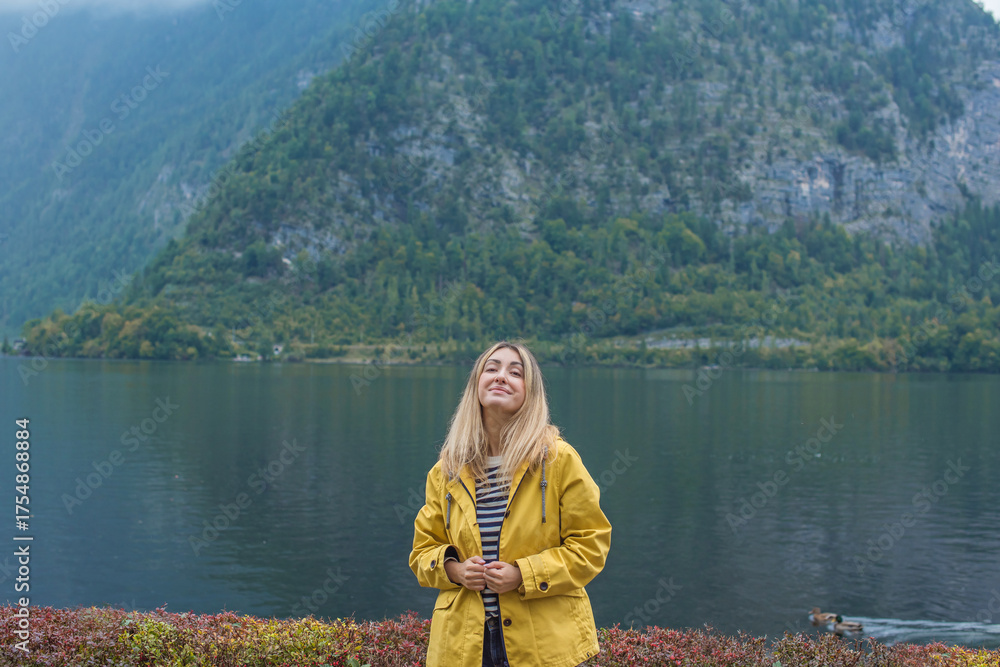 Tourist Lady Exploring Austrian Lake, Yellow Jacket Travel Concept