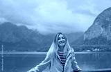 Tourist Lady Exploring Austrian Lake, Yellow Jacket Travel Concept
