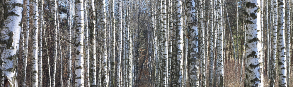 Trunks of birch trees, birch forest in spring, panorama with birches