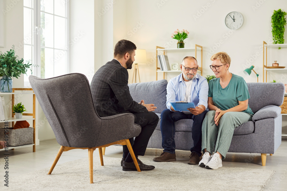 Smiling elderly couple meets agent at home, reviewing documents and signing agreements while discussing real estate options. Seniors discussing insurance or investment contract with advisor