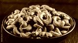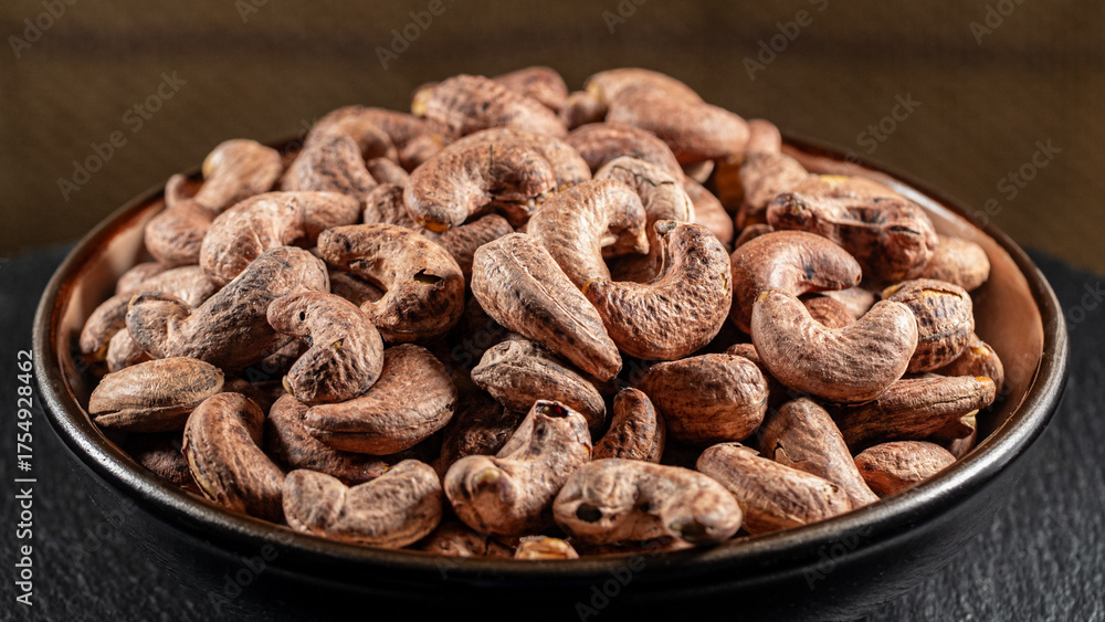 Close-up Shot of Roasted Salted Nut Heap Snack Cashew in Shell in Ceramic Bowl on a Burlap Background