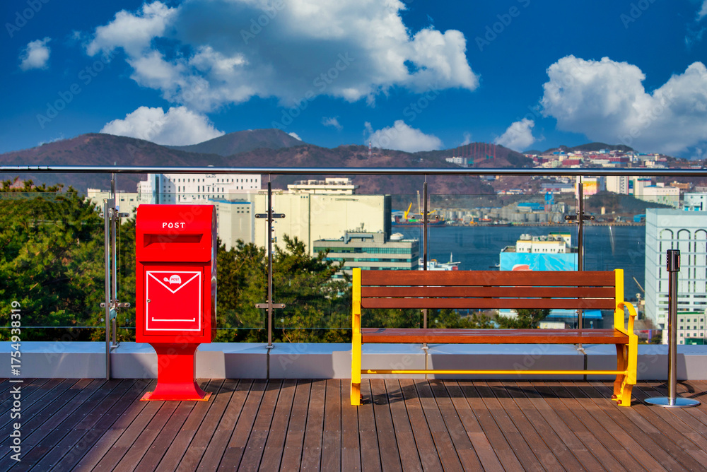 Busan Air Cruise view of Busan city with Haeundae beach in Busan, South Gyeongsang Province, South Korea.