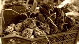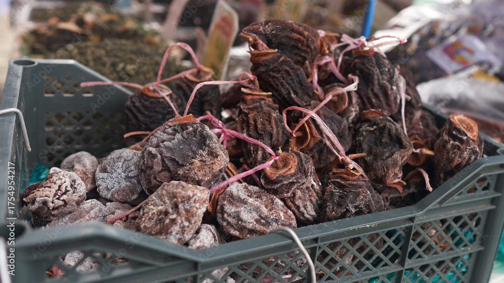 A farmers' market with a variety of goods on display. In the foreground is a crate with bundles of dried persimmons.
