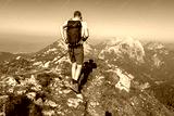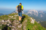 A male hiker with a backpack and poles traverses a grassy, sunlit ridge on Loibler Baba, absorbed in the stunning panoramic vista of Karawanks mountain range in Slovenia, a perfect alpine adventure.