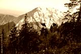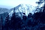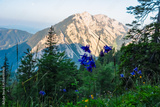 Vibrant blue Alpine Columbine flowers bloom in a lush meadow, with the majestic Wertatscha mountain creating stunning backdrop at sunrise. Idyllic scene captures beauty of flora in Slovenian Karawanks