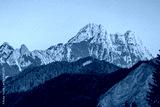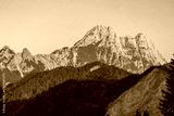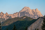 A panoramic view of the majestic Wertatscha and Karawanks range at sunrise, with golden light illuminating the peaks. In foreground, lush green hills and a quarry show mix of nature and human impact
