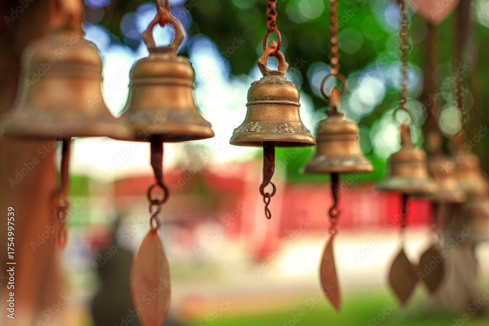 Antique bronze bells hang from chains against a backdrop of greenery and soft bokeh.