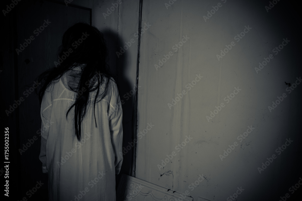 Creepy horror woman with long hair and white dress standing in dark haunted hallway. Perfect scary concept for Halloween posters, horror movie promotions, or ghost story illustrations.
