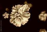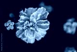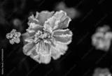 nature with orange marigold flowers covered with cold transparent crystals of hoarfrost on a frosty morning in the autumn garden