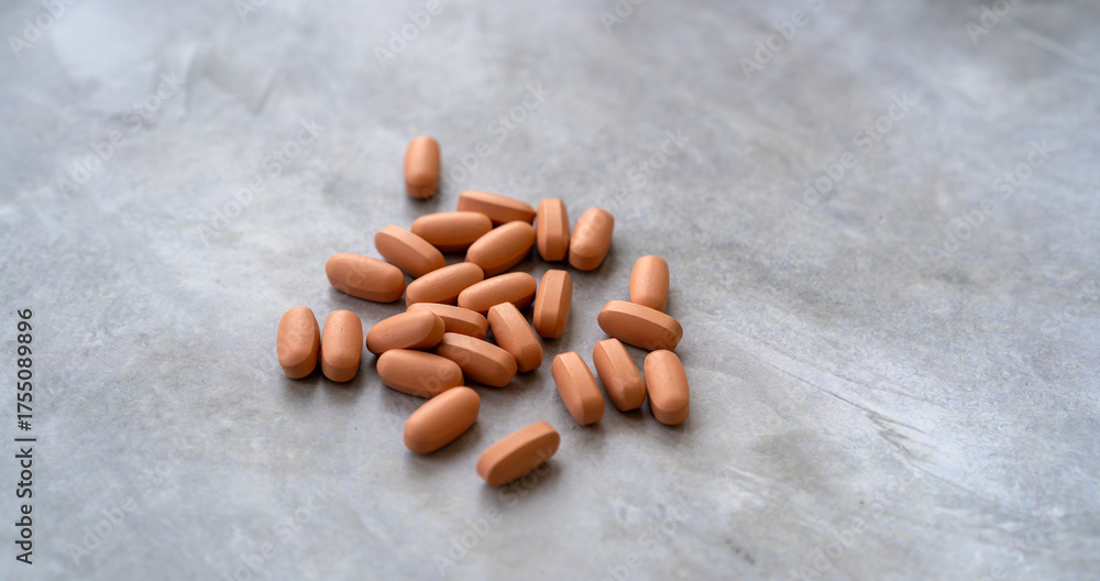 Vitamins in tablets on a marble table.Vitamin supplements for food.