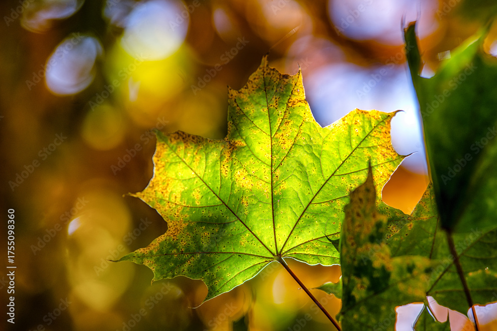 Green autumn maple leaf illuminated by sunlight with soft bokeh background