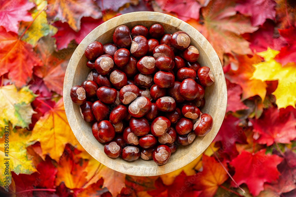 Wooden bowl full of chestnuts on colorful autumn maple leaves background