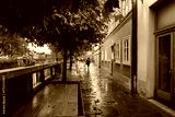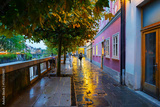 Sidewalks wet from rain reflect lights from sidewalk cafes and shops along the Ljubljanica River at dusk in the old town center of Ljubljana, Slovenia.