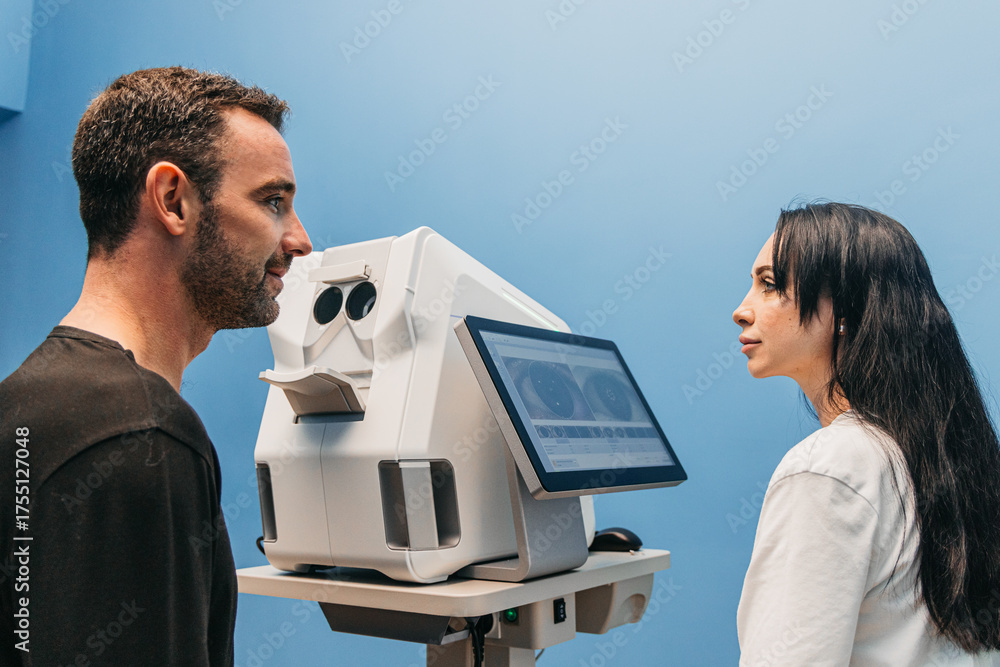 Male patient and female eye care professional engaged in an eye examination, with advanced diagnostic equipment and a calming blue background, showcasing modern healthcare practices