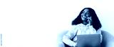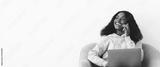 Happy pretty young black woman in casual sitting at arm chair by empty white wall, having phone conversation with business partner, working online from home, using laptop, copy space