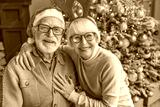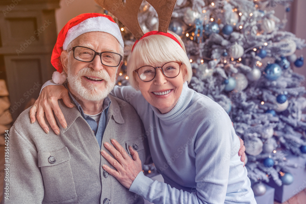 Portrait of happy smiling senior couple in santa hats celebrating at home. Elderly old grandparents hugging embracing cuddling for Christmas New Year Eve looking at camera together